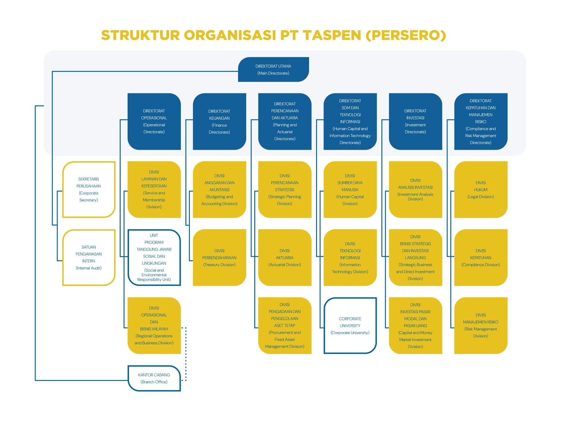 Struktur organisasi yang kuat membantu TASPEN agar dapat beroperasi dengan efisien, produktif, dan secara kolektif senantiasa terarah pada tujuan perseroan.